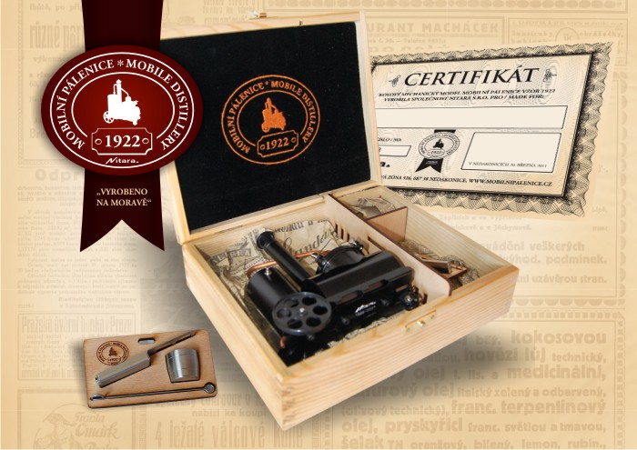 Modely mobilní pálenice jsou vyráběny v malých limitovaných sériích a jejich precizní zpracování, funčnost a použití kvalitních kovových materiálů z nich dělá zajímavý, sběrateli vyhledávaný technický unikát. Na model pálenice jsme použili kvalitní hliníkové slitiny, s černým eloxovaným povrchem, který výborně odolává korozi i vysokým teplotám.