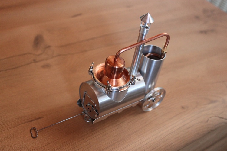 Modely mobilní pálenice jsou vyráběny v malých limitovaných sériích a jejich precizní zpracování, funčnost a použití kvalitních kovových materiálů z nich dělá zajímavý, sběrateli vyhledávaný technický unikát. Na model pálenice jsme použili kvalitní hliníkové slitiny, s černým eloxovaným povrchem, který výborně odolává korozi i vysokým teplotám.